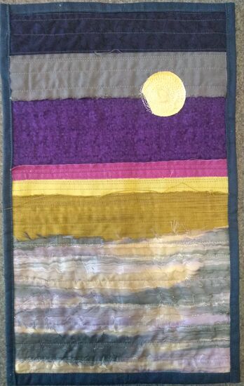Cotton and other fabrics; hand and machine stitched. 16" x 10"